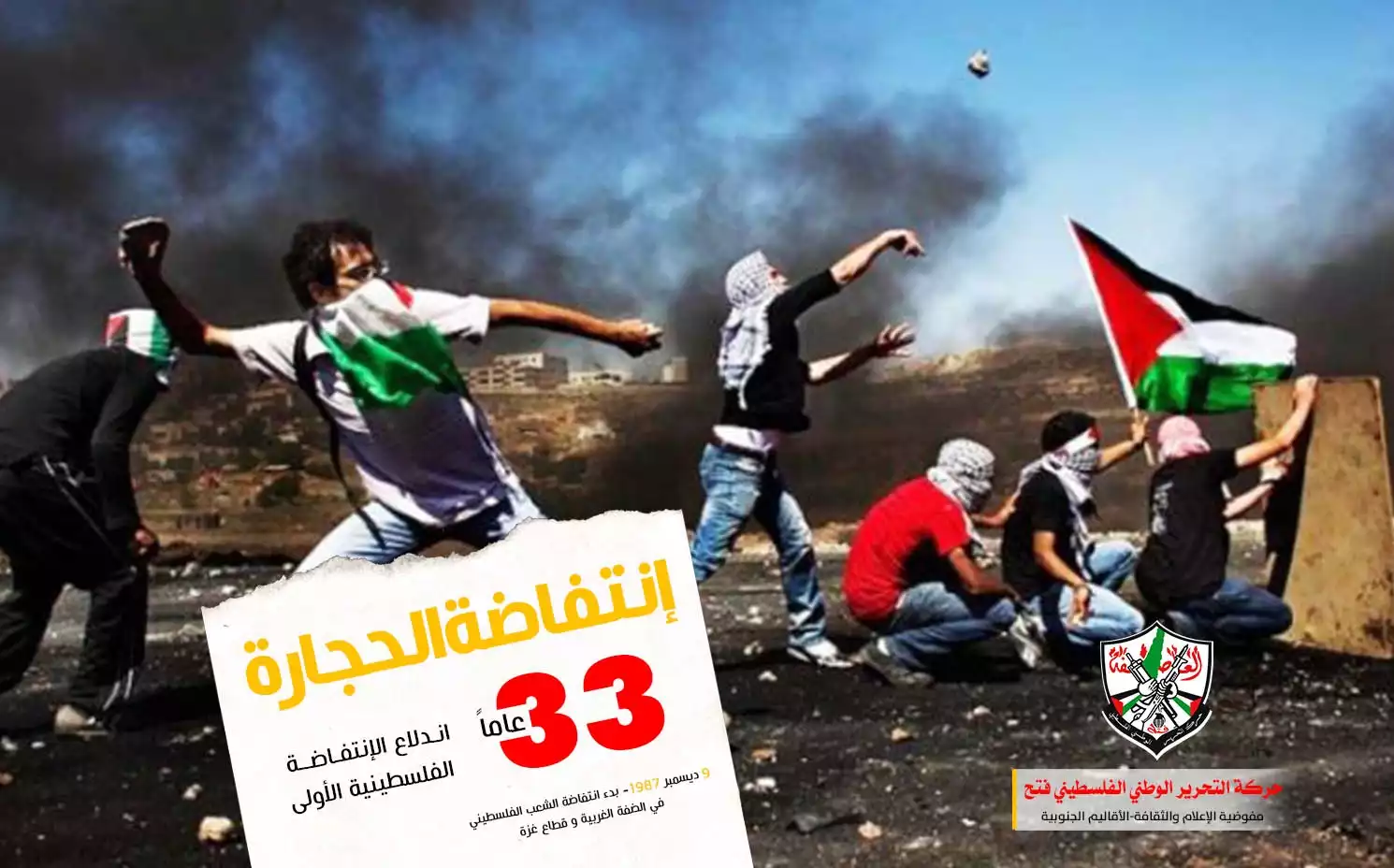 أحييت حركة التحرير الوطني الفلسطيني "فتح"، الذكرى الـ 33 لاندلاع الانتفاضة الفلسطينية الأولى، مشيرة إلى أن تلك الانتفاضة أثبتت للعالم أجمع أن المواطن الفلسطيني لن يقبل بأي شكل من الأشكال التعايش مع الاحتلال مهما طال الزمن.