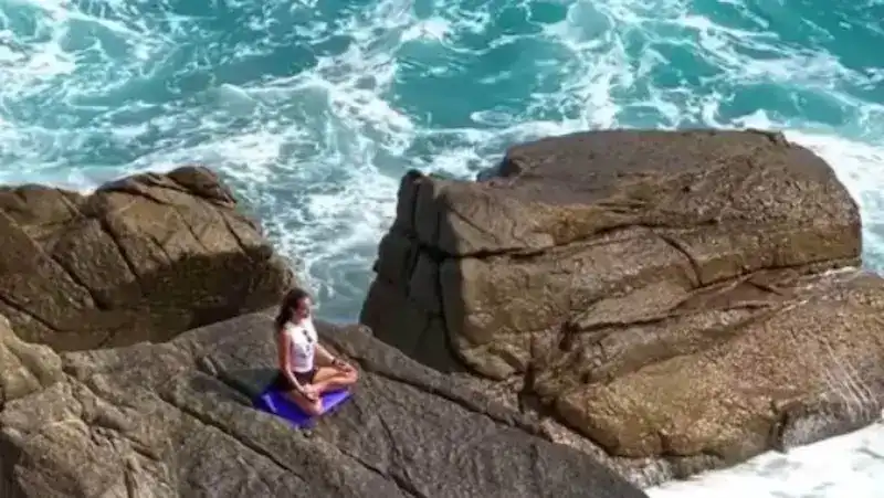اليوغا، واصطحبت معها حصيرة اليوغا وبالفعل جلست على أحد الصخور وبدأت في ممارسة