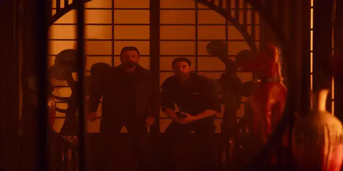 يرتديان بدل من اللون الأسود، ويحملان في أيديهم أسلحة، حيث يشير طرح البوستر