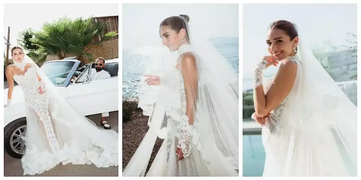 في اليونان، وجاء فستانها طويل وضيق ومن الدانتيل الأبيض، وأجزاء منه شفافة، وهو