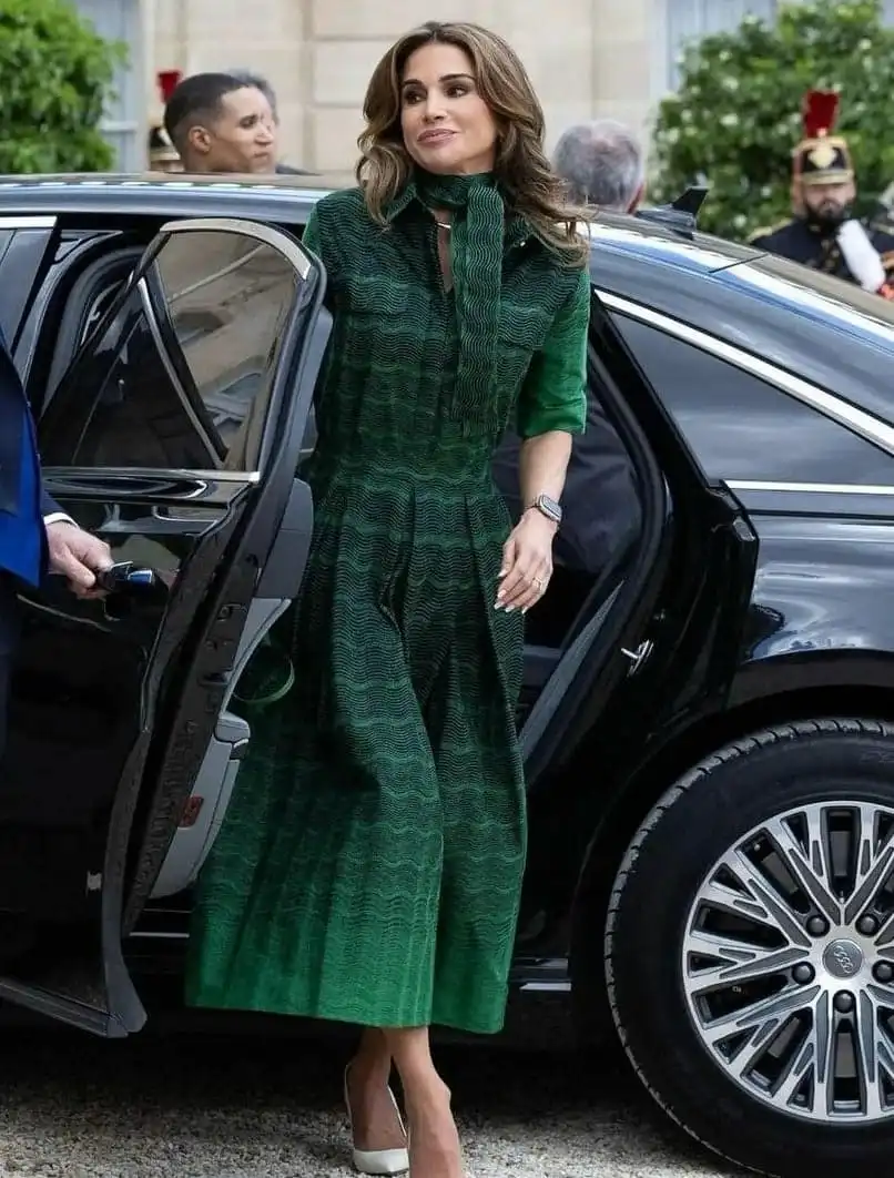 وتألقت ملكة الأردن باللون الأخضر من مجموعة المصمم اللبناني إيلي صعب ما قبل خريف 2024