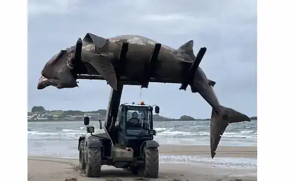 جرفت الأمواج قرشًا ضخمًا يبلغ طوله 24 قدماً (حوالي 7 أمتار) إلى شاطئٍ في المملكة المتحدة نهاية الأسبوع الماضي، وتطلّب الأمر استخدام رافعةٍ شوكيةٍ لسحب الكائن الضخم من على الشاطئ.
